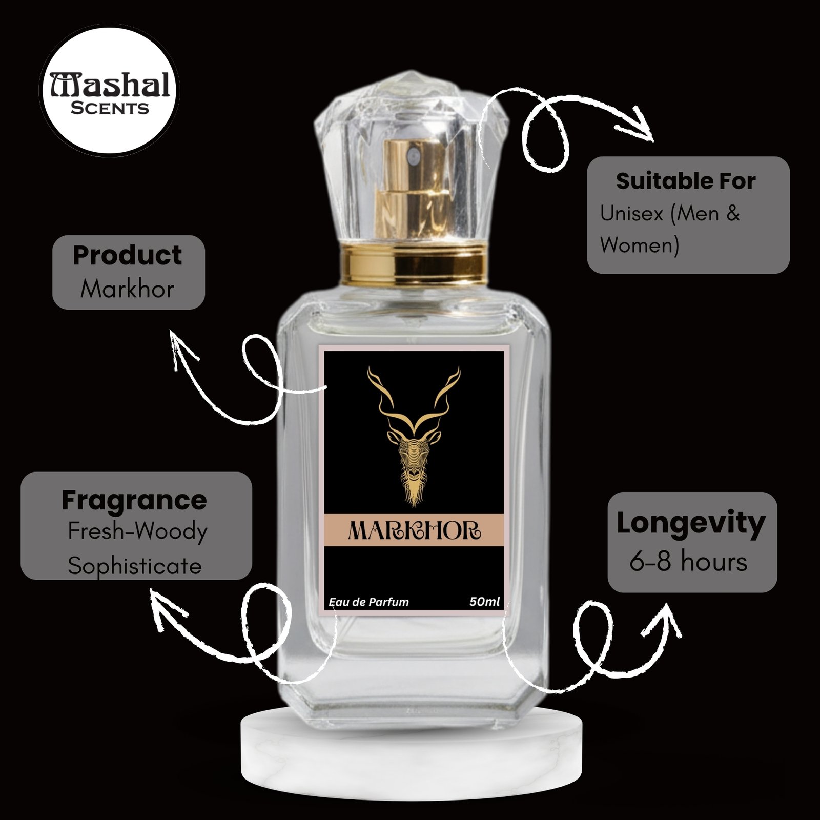 Markhor by Mashal Scents is an energetic and commanding fragrance inspired by the spirit of Pakistan’s majestic national animal. Fresh, powerful, and confidently masculine, it blends vibrant top notes with deep woody undertones for a scent that stands out naturally. Ideal for daily wear, outdoor adventures, and anyone who carries a strong, fearless personality.